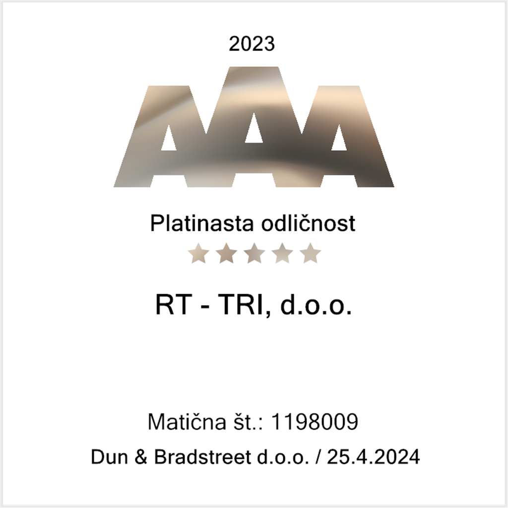 AAA – platinasta odličnost za leto 2023 je dokaz predanosti in dolgoročne usmerjenosti v pozicioniranje na trgu na najvišjem nivoju. Za nas je izkazano zaupanje dokaz, potrditev in nagrada za delo, ki ga z veseljem opravljamo v zadovoljstvo nas v podjetju, naših poslovnih partnerjev in končnih kupcev, ki naše proizvode uporabljajo.